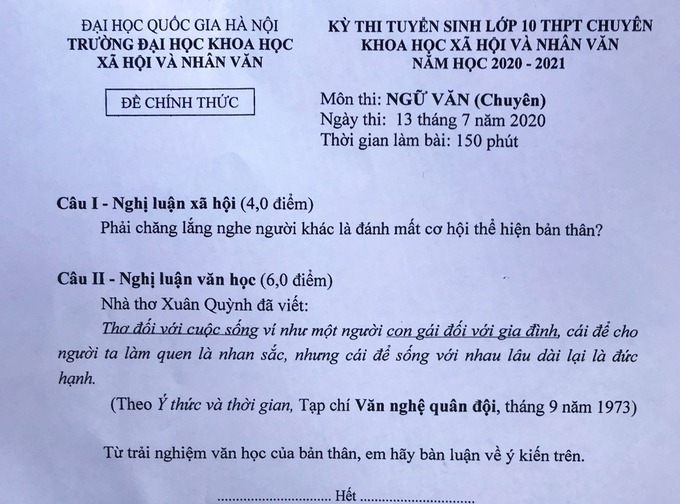 Sáng 13/7, hơn 500 học sinh làm đề thi Ngữ văn chuyên để cạnh tranh 30 suất vào lớp Ngữ văn, trường THPT chuyên Khoa học Xã hội và Nhân văn. Trong 150 phút, thí sinh phải làm câu nghị luận xã hội 4 điểm bàn về việc “lắng nghe người khác có phải là đánh mất cơ hội thể hiện bản thân?” và câu nghị luận văn học 6 điểm sử dụng nhận định của thi sĩ Xuân Quỳnh để bàn về thơ ca thông qua hình ảnh “nhan sắc”, “đức hạnh” của người con gái.