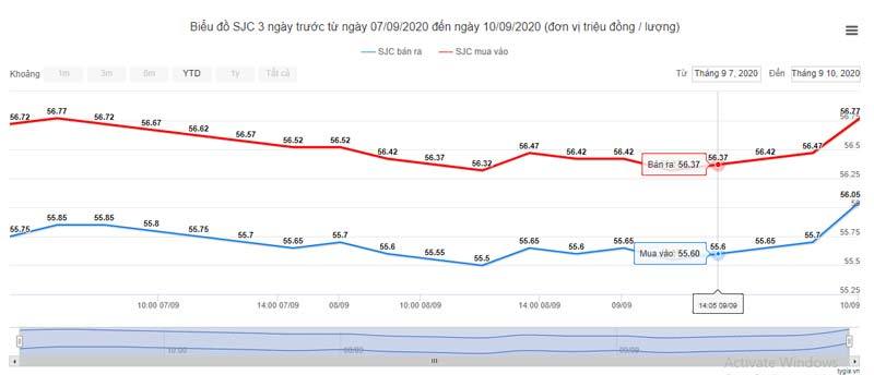 Công ty vàng bạc đá quý Sài Gòn niêm yết giá vàng SJC áp dụng cho khu vực Hà Nội ở mức 56,00 triệu đồng/lượng (mua vào) và 56,72 triệu đồng/lượng (bán ra), tăng 300 nghìn đồng ở chiều mua vào và tăng 250 nghìn đồng ở chiều bán ra so với cuối phiên giao dịch 9/9.