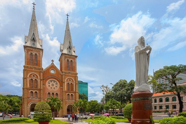 Nhà thờ Đức Bà có tên đầy đủ là Vương cung thánh đường chính tòa Đức Mẹ Vô nhiễm Nguyên tội. Vào năm 1877, công trình được khởi công xây dựng với bản thiết kế của kiến trúc sư J.Bourard với phong cách kiến trúc Roman pha trộn Gothic. Tất cả nguyên vật liệu từng được cho là chuyên chở từ Pháp và một số nước châu Âu qua Việt Nam.