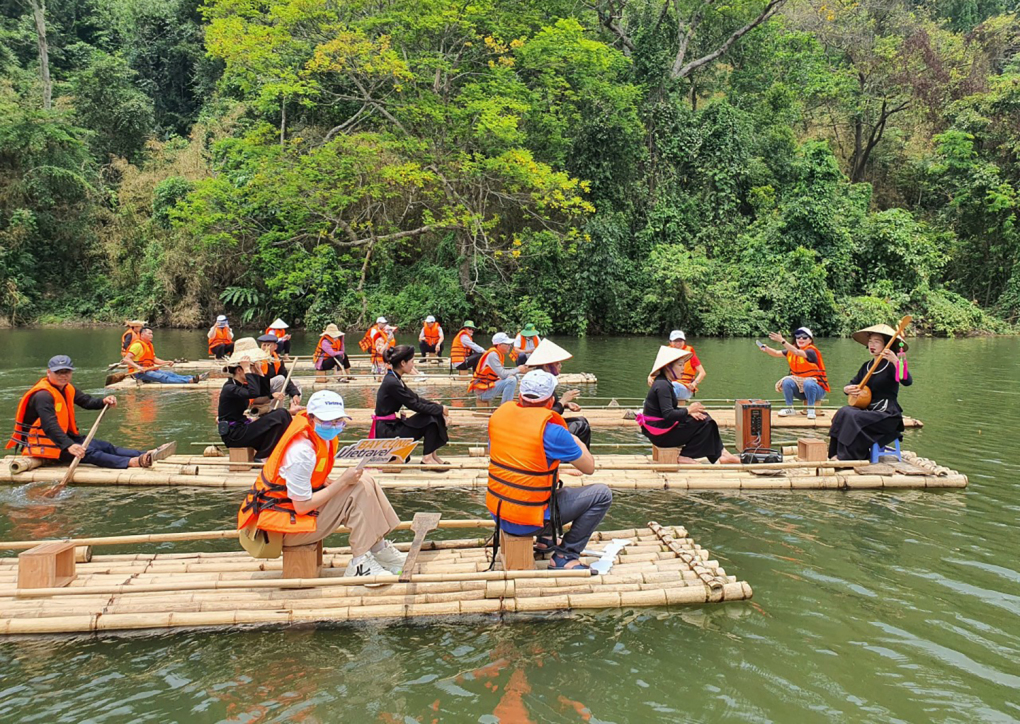 Nhóm du khách TPHCM nghe hát Then và trải nghiệm ngồi bè mảng khi tham quan Tuyên Quang. Ảnh: Vietravel